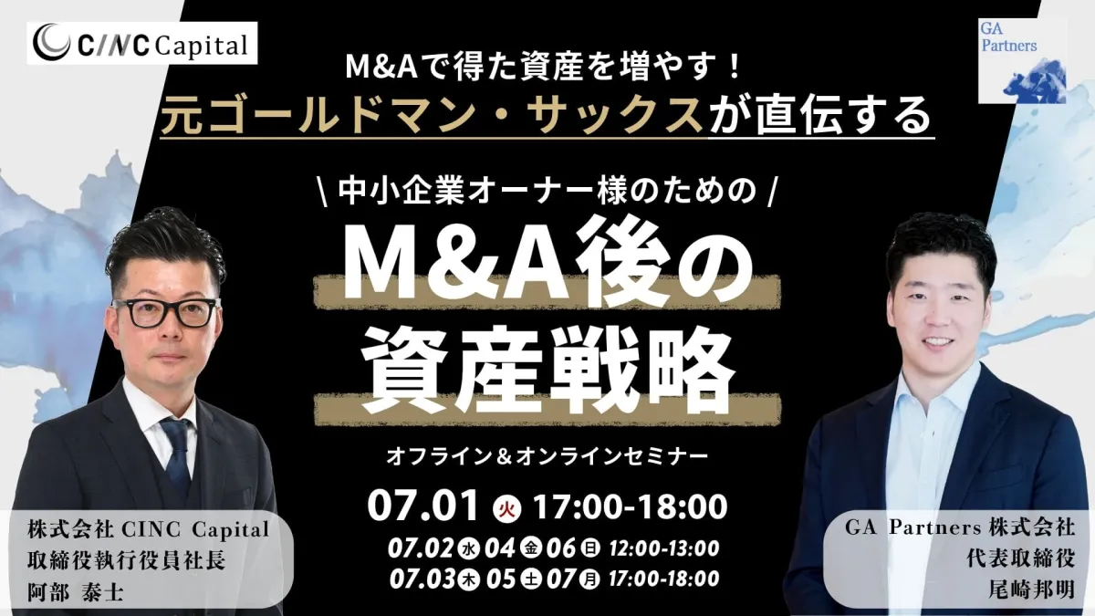 株式会社CINCの子会社、CINC Capitalは、経営者向けに特化したオンラインウェビナーを7月1日(火)に開催します。このウェビナーでは、元ゴールドマン・サックスの専門家が、M&A後に直面するお金の課題とその対策について解説します。