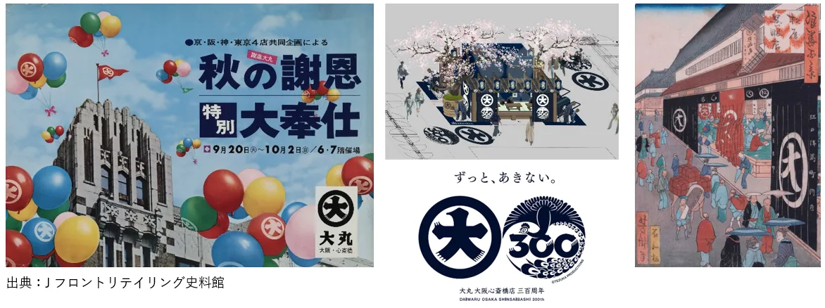 300周年を記念したロゴは、手塚治虫の『火の鳥』をモチーフにしており、過去と未来がつながるというテーマを表現しています。このロゴは、大丸心斎橋店の根本にある「商い」に対する誓いを象徴しており、長い歴史に支えられた店舗の顔とも言える存在です。