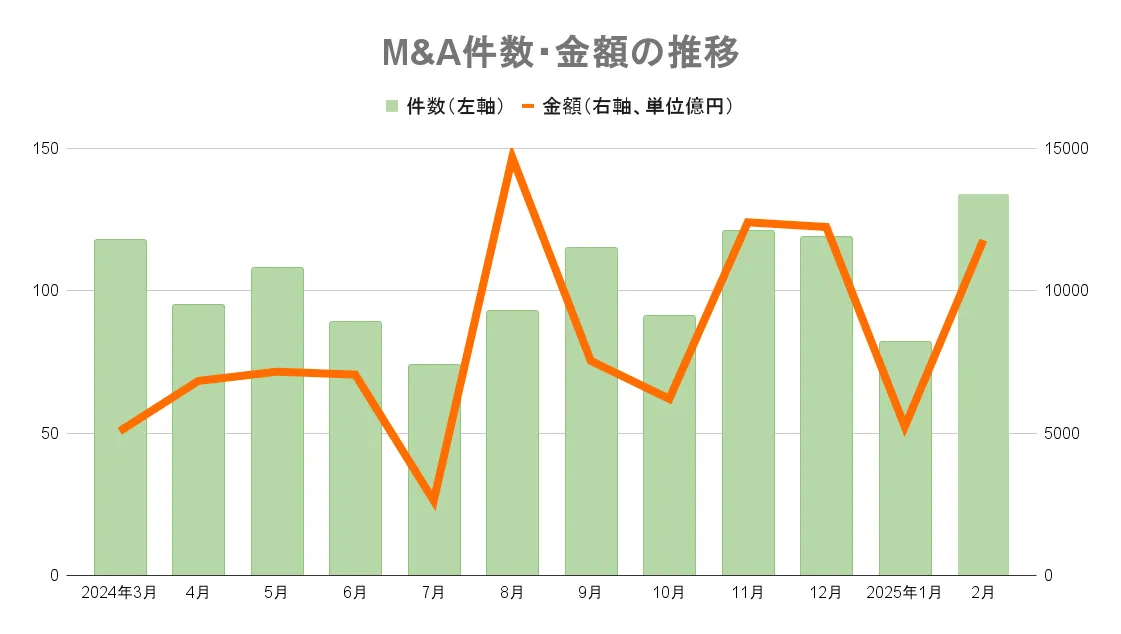 2025年2月の日本におけるM&A市場は、前年同月比で取引件数が134件と36件の増加を見せ、取引総額は1兆1778億円へと、前年比で約1割の伸びを記録しました。このデータは上場企業の適時開示情報をもとに、M&A Online編集部が集計した結果です。