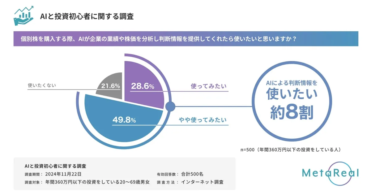 株式会社メタリアルが実施した最新の調査結果によれば、投資初心者の約80%が個別株の売買においてAIの活用を希望していることが明らかになりました。この調査は、年間360万円以下の資産運用を行う20代から60代の男女500名を対象に実施され、AIを用いた投資アドバイスが今後ますます重要になることを示唆しています。