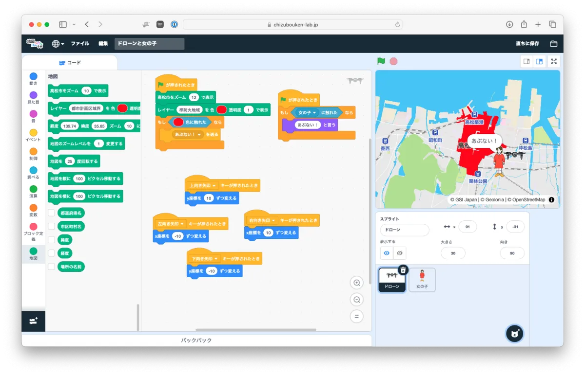 「地図ぼうけんラボ」は、広く知られたプログラミングツール「Scratch」とデジタル地図を組み合わせています。これにより、ユーザーは地図を表示し、さまざまなキャラクターを配置し、それをScratchの互換ブロックを用いてプログラミングすることが可能です。この視覚的なアプローチにより、子どもたちは直感的に学ぶことができるため、プログラミングをより身近に感じることが出来ます。