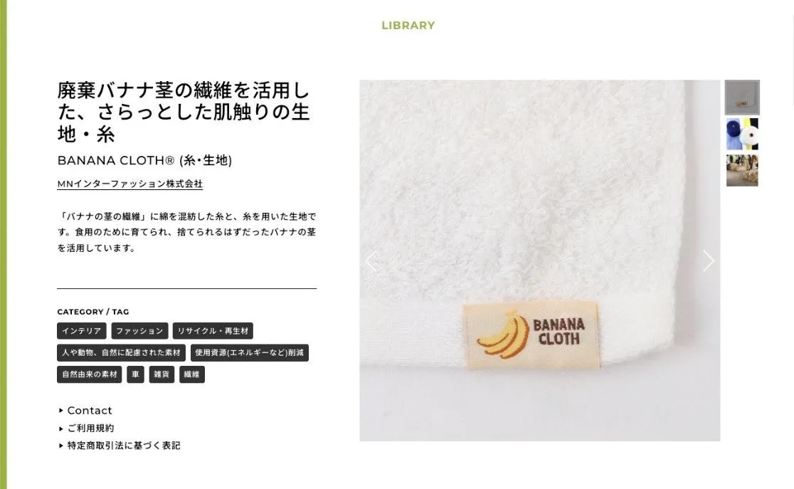 MNインターファッション株式会社はこの「BANANA CLOTH」を、「SENSE-Laboratory」のWEBサイト内コンテンツ「Library」に掲載しました。これは、サステナブル素材の探求を行う企業やクリエイターに対し、価値のある情報を提供することを目的としています。特に、素材の活用方法や今後の素材開発に関する提案が紹介されており、ビジネスに新たな視点を提供する役割を果たしています。