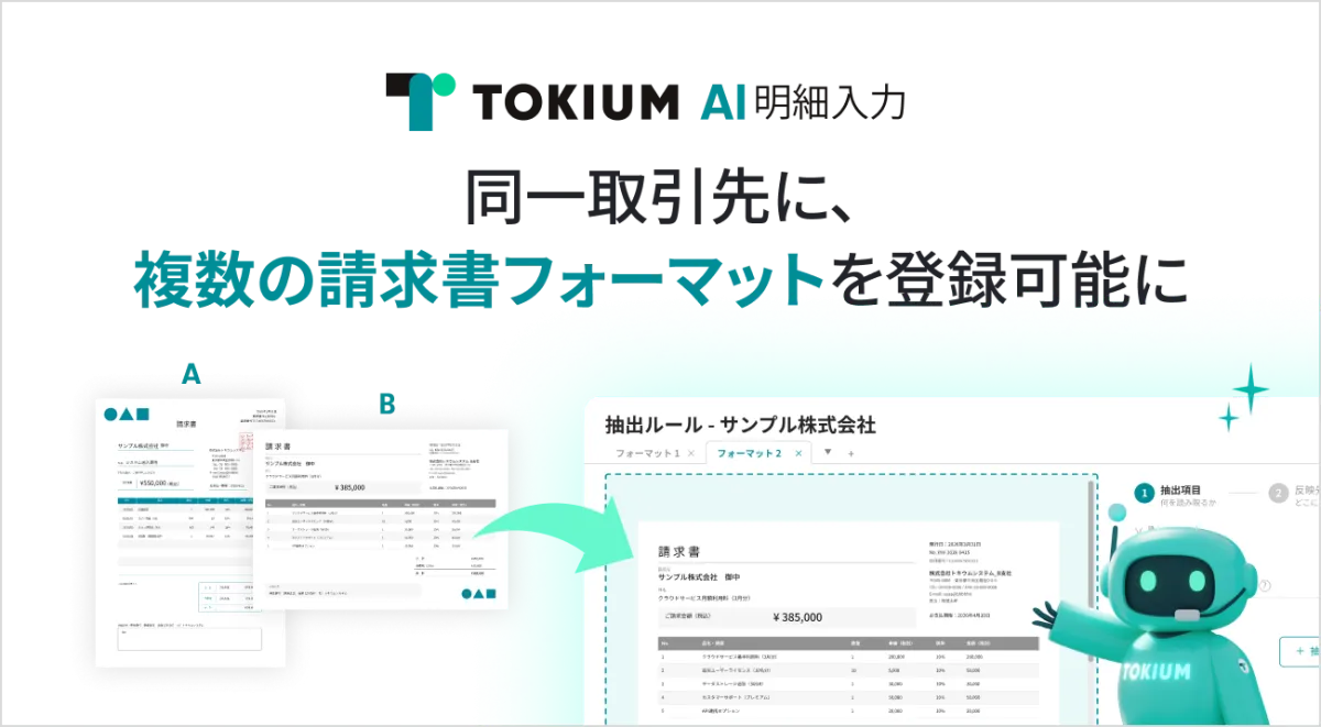 このような現状を受けて、TOKIUMは同一取引先に対して複数の請求書フォーマットを管理できる機能を提供開始しました。これにより、企業は異なるフォーマットの請求書を受け取っても、円滑に仕訳を行えるようになります。