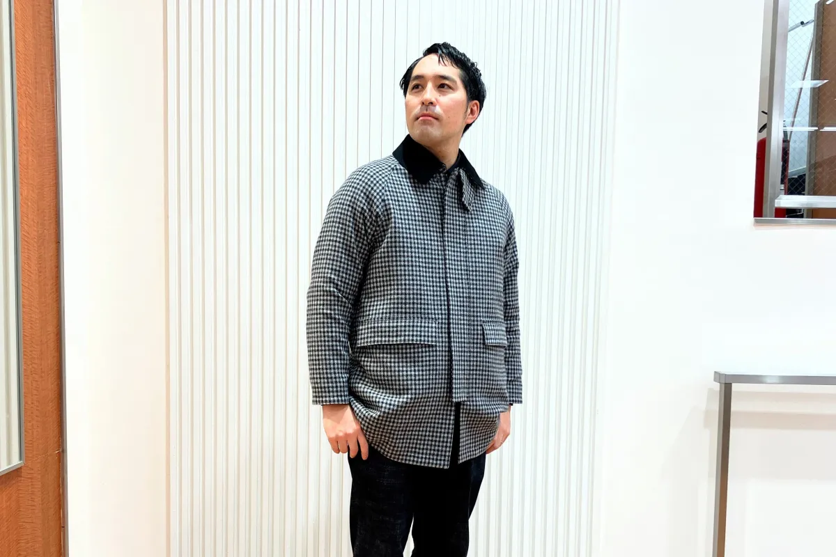 「ウエアシフトコート」のデザインは、オンオフどちらでも対応できるショート丈のステンカラーコートです。襟の部分にはコーデュロイが使われており、そのアクセントが際立っています。ストラップを留めることで襟のスタイルを変えることができ、多様なシチュエーションで活用することが可能です。
