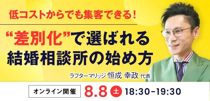 結婚相談所の運営を考えている方にとって、どのようにして成功するかは重要な課題です。しかし、開業にあたり、資金面や集客の難しさが立ちはだかることも少なくありません。そんな中、2025年8月8日(金)の夜、オンラインで開催される「低コストからでも集客できる!結婚相談所の始め方」セミナーは、まさにそのヒントを提供してくれると言えるでしょう。