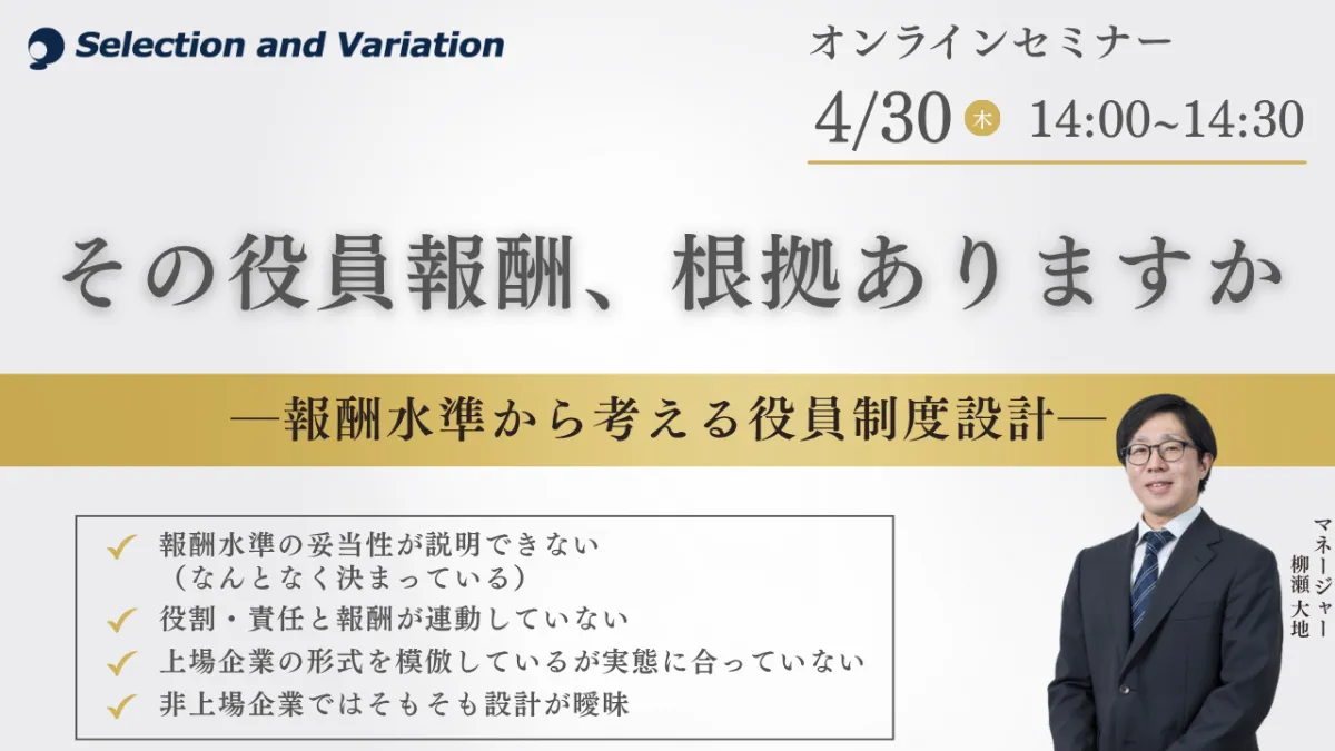組織と人事に特化したコンサルティングファームであるセレクションアンドバリエーション株式会社が、2026年4月30日(木)14:00から「その役員報酬、根拠ありますか ―報酬水準から考える役員制度設計―」セミナーを開催します。このオンラインセミナーは、コーポレートガバナンスの向上が求められる昨今において、特に取締役や執行役員制度の設計方法に光を当てています。