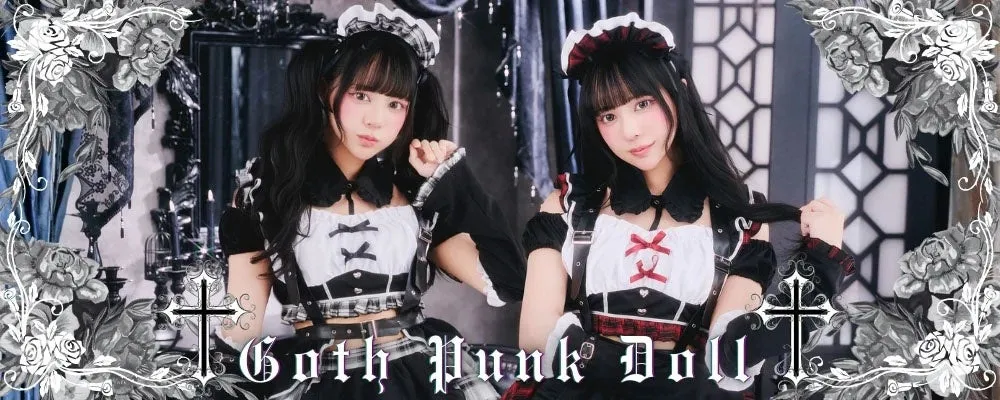 ブラックを基調としたメイドコスチュームは、モノトーンと赤チェックの組み合わせが印象的です。ハーネス付きベルトやアームカバーもセットになっており、エッジの効いたスタイルを演出します。ハード感を巧みに取り入れたこのデザインは、独特の存在感を放っています。価格は各¥9,990(税抜)です。