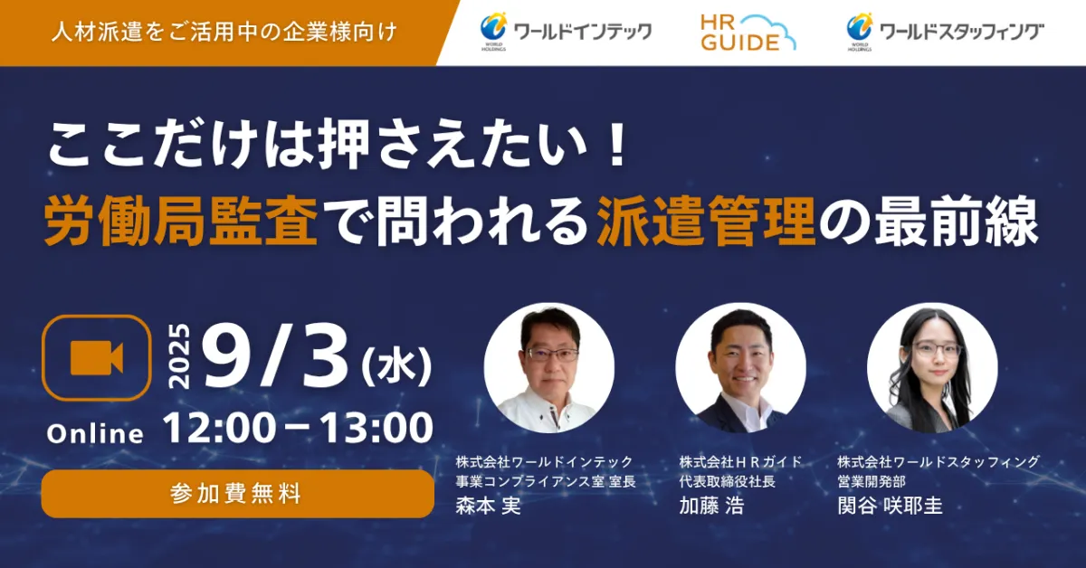 株式会社ワールドインテックが主催するウェビナーが、2025年9月3日(水)にオンラインで開催されます。このウェビナーのテーマは「ここだけは押さえたい!労働局監査で問われる派遣管理の最前線」。最近、派遣先企業にはより厳格な「派遣管理の精度」が求められています。これは、監査の際に「知らなかった」と言って済む話ではなく、企業にとってリスク回避のための重要なファクターです。