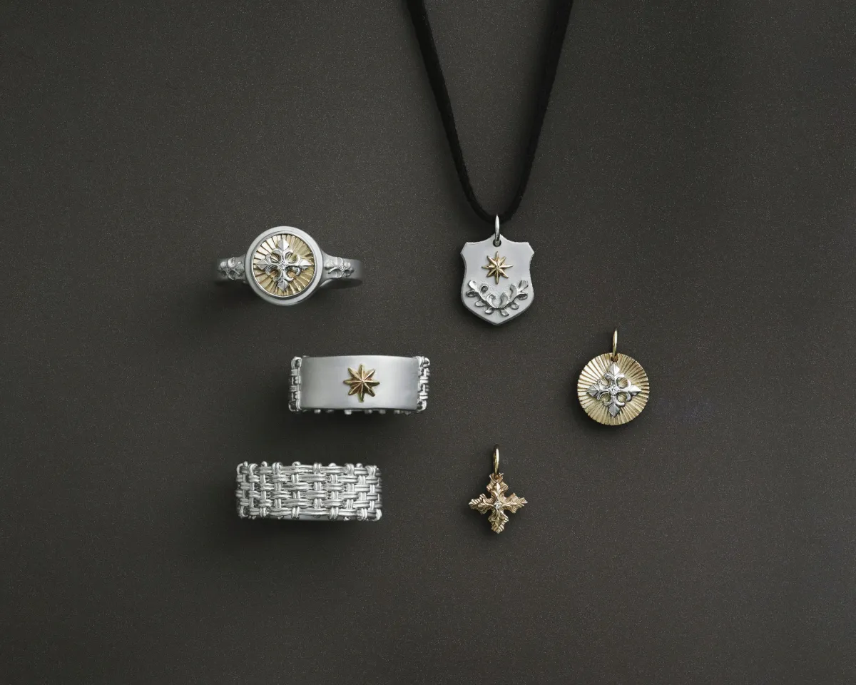 鎖帷子を形取ったリングは、細かな編み込みが施され、反対側には輝く星が配されています。一方、クロスモチーフのリングは独特の煌めきを放ち、見事な立体感が感じられます。