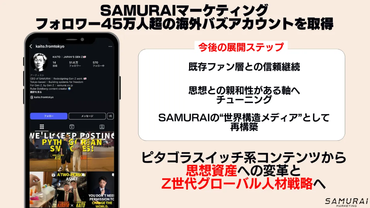 株式会社SAMURAIは、これまでにも「キャリア」「経済」「自己理解」をテーマにしたプロジェクトを展開してきましたが、今後はこのアカウントを通じて表現の幅を広げていく方針です。例えば、これまでの論理的なコミュニケーションに加え、感覚的に受け取れる内容を構築し、非言語的な共通文脈を形成することで、メッセージをより深く届けることを目指しています。
