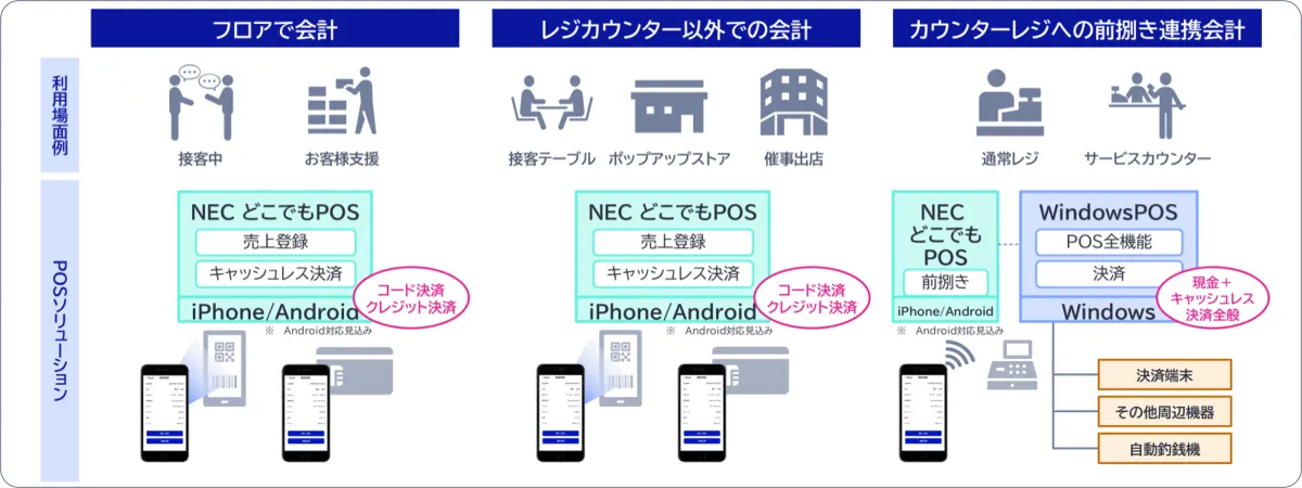 さらに「NEC どこでもPOS」は、既存のPOS環境と円滑に連携できる点も魅力です。新規に大規模なシステムを導入することなく、既存のデータを活用しながら段階的にデジタルトランスフォーメーション(DX)を進めることが可能です。これならば、ITのコストを抑えつつも、新しい技術を活用することができます。