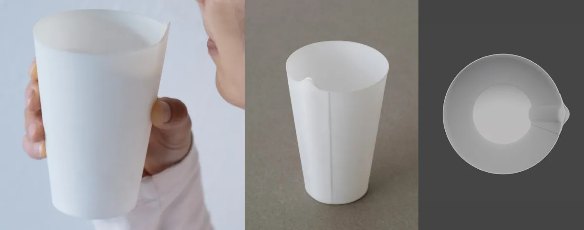 このコップには、紙コップの製造過程で生じる接着部分に筒状の空間を設け、コップの内部底部に穴を開けるという革新的な設計が施されています。これにより、少ない力で飲むことができるため、体に不自由のある方々にも利用しやすい設計となっています。直接飲むスタイルとも、ストローを使うスタイルとも異なる新たな飲み方を提案し、利用者の方々により快適な体験を提供します。