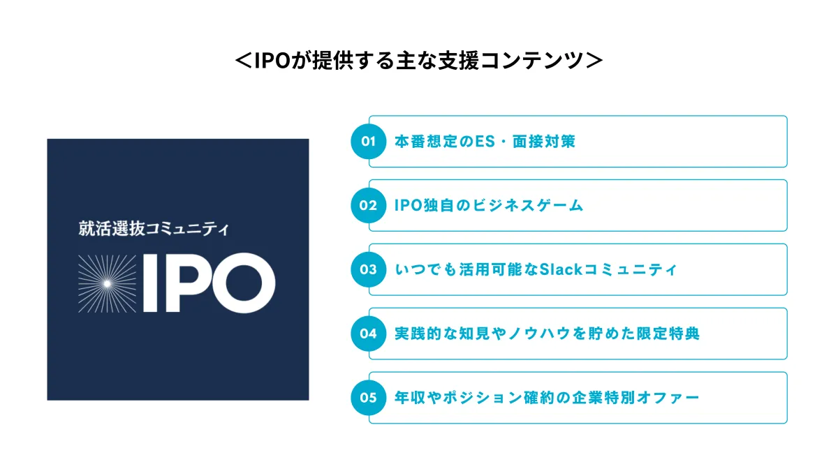 『IPO』は、長期インターンシップの経験者のみが参加できる選抜型の就活コミュニティです。学歴ではなく、実務経験に基づいてメンバーが選ばれ、学生たちはインターンで培ったスキルを活かした就職活動が可能です。