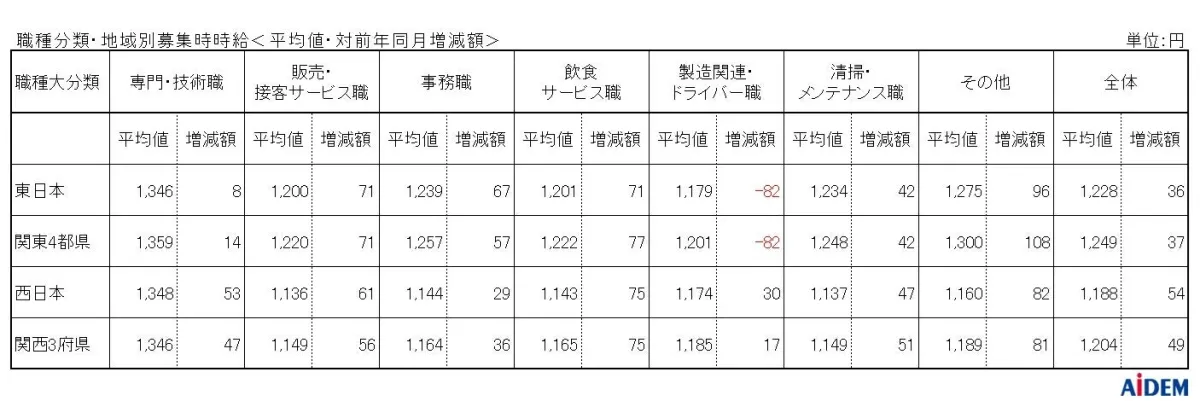 調査結果によると、東日本エリアの平均時給は1,228円で、前年同月比で36円の増加となりました。一方、西日本エリアでは平均時給が1,188円で、前年より54円増加しています。この結果から、地域による時給の差が明確に示されています。
