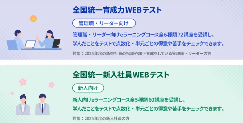 全国統一育成力WEBテスト:このテストは、管理職やリーダー向けに、ビジネスに必要な知識や考え方の理解度を測る内容です。全6種類、72講座が用意され、試験は60分間、50問で構成されています。