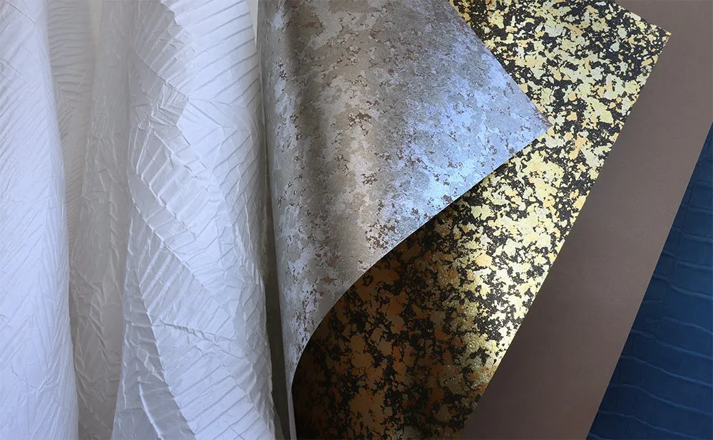 「NAORON」に独自の加工を施した「NAORON+」は、日本の職人による加飾加工が施された珍しい素材です。特に京都の伝統工芸を活かした金銀箔押しや、友禅染めなど、各地の職人技が集まり、革製品に似たエンボス加工によるアニマルフリー素材としての位置付けもされています。