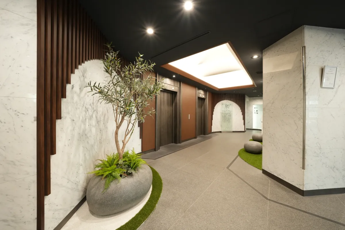 また、エレベーターホールにも注意を払い、樹木や石を模したプランターとベンチを配置しています。これにより、来訪者が自然に導かれるような設計になっており、リラックスできる雰囲気を楽しむことができます。加えて、サインも名称変更に合わせて一貫したデザインが採用されています。