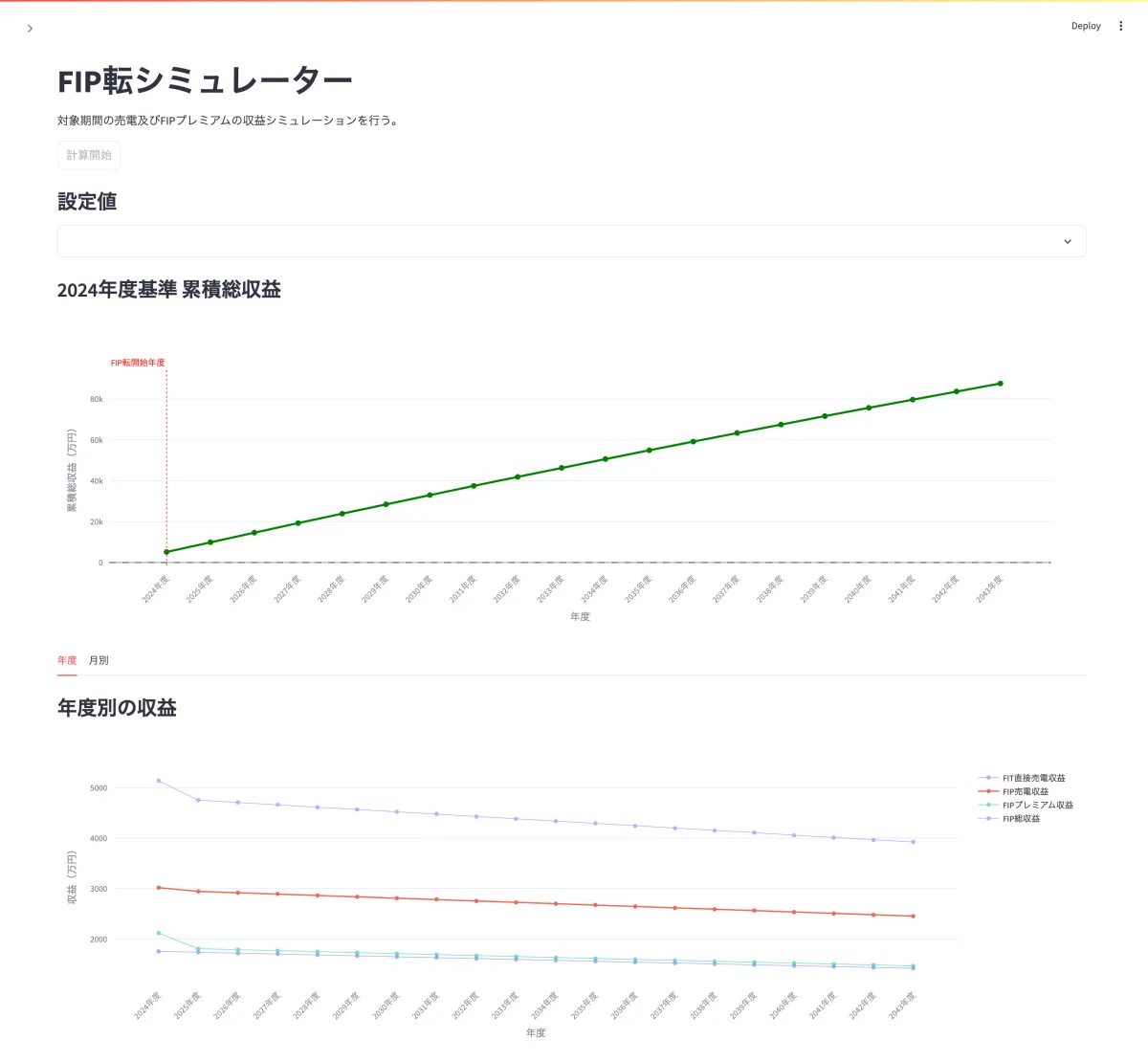 このシミュレーションでは、売電収益やFIPプレミアムだけでなく、需給調整市場参加による追加収益も統合的に試算します。様々な時間軸で収益構造をグラフ化し、事業の収益ポテンシャルを明確に可視化します。