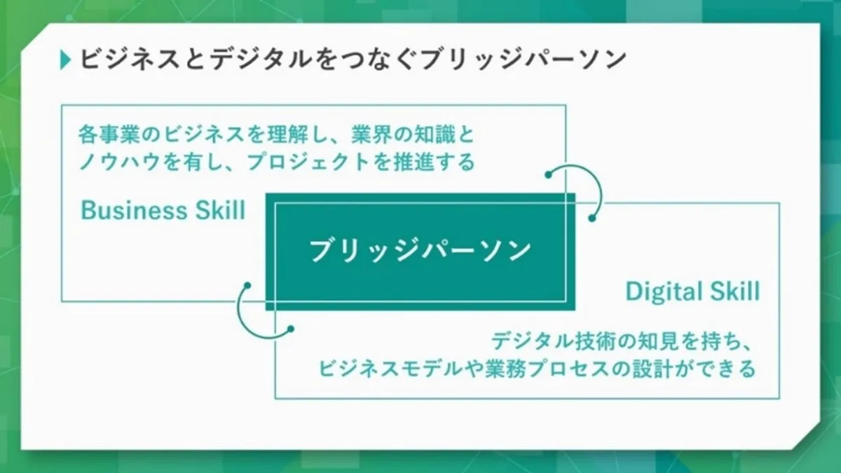「ブリッジパーソン」は、ビジネスとデジタルの架け橋として、変革を推進する存在です。DXの進行に伴い、特にこのポジションを担う人材がもっと求められています。東急不動産は、この考えに基づき、現在進行中の多数のプロジェクトを効果的に進めるために、ブリッジパーソンの育成に注力しています。
