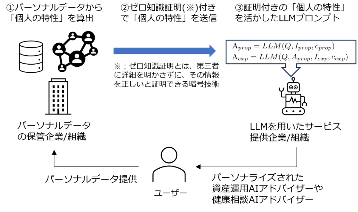 本論文の提案する技術は、ゼロ知識証明(Zero-Knowledge Proof)を利用することで、個人のパーソナルデータを直接活用することなく、抽象的な「個人の特性」を推論し、その結果のみをLLMサービスに送信するものです。この手法により、詳細データを保持することなく、パーソナルデータの保護と活用を同時に実現できます。