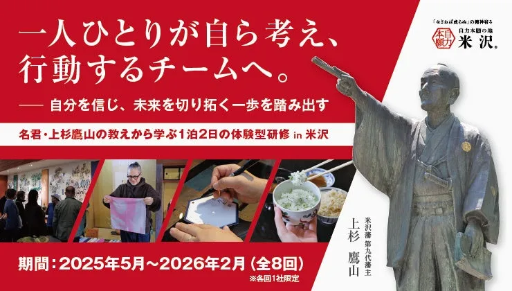 企業が直面している不確実な時代、必要とされる人材はただ与えられた知識を受け取るだけでは不十分です。「自ら考え行動できる力」を養うため、米沢市で1泊2日の体験型研修ツアーがスタートします。この研修は「自力本願の地 米沢 ~自分に誓う旅~」として、上杉鷹山の精神を学びながら、参加者は自分自身と向き合う貴重な機会を得ます。
