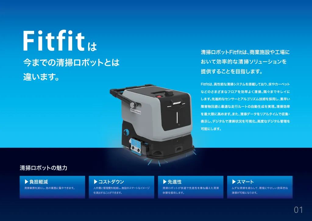 近年、商業施設や医療施設、オフィスビルなどでの清掃質の確保や人件費削減が大きな課題となっています。このようなニーズに応えるため、ロボットバンクは『Fitfit』を開発しました。効率的かつ高品質な清掃業務を支援することが、企業のDX(デジタルトランスフォーメーション)推進に繋がると考えています。
