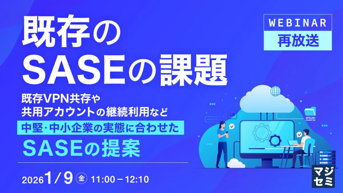 このような背景の中で、今月開催されるウェビナーでは、中堅・中小企業に最適なSASEの導入方法を紹介します。具体的には、既存のVPNや共用アカウントを活用しつつ、段階的にゼロトラスト化を進める現実的なアプローチを提案します。さらに、中小企業に必要な機能を絞り、コストを抑えながらもセキュリティ水準を向上させる「KAMOME SASE」を紹介し、柔軟な構成例も提示します。