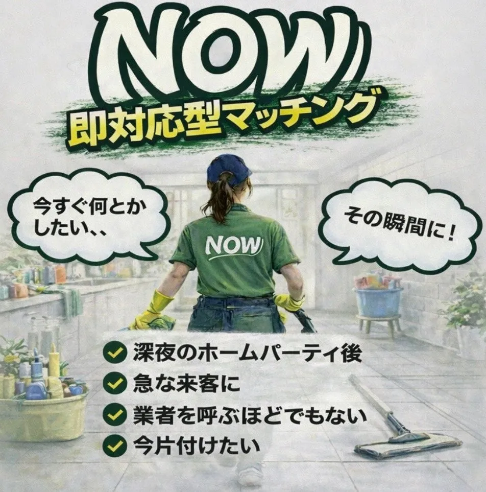 近年、共働き世帯の増加やライフスタイルの多様化に伴い、家事代行サービスの需要が高まっています。しかし、利用者が求めるのは必ずしも定期的なサービスではなく、突発的なサポートを必要とするケースが増えています。家が急に散らかってしまった時や、すぐに手を貸してもらいたい時に利用できる「NOW」は、こうした隙間を埋めるために誕生しました。