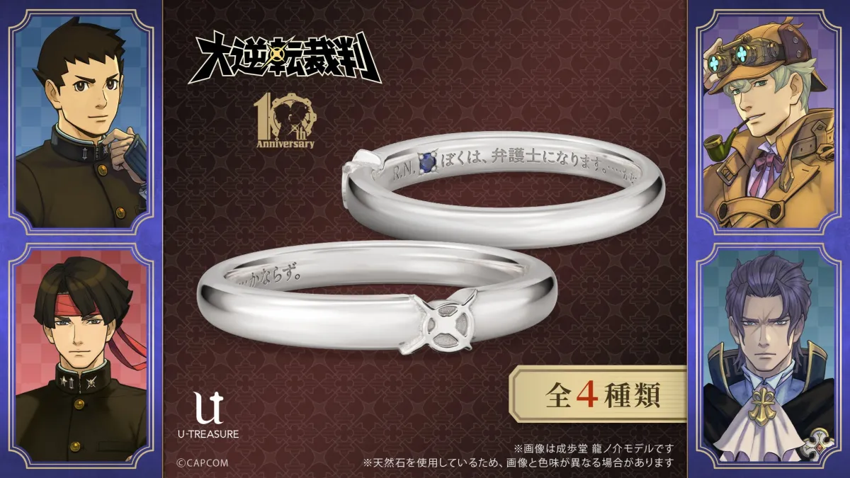 「大逆転裁判」シリーズが2025年7月9日に10周年を迎えるのを記念して、特別なメッセージリングが誕生しました。このリングは、成歩堂、亜双義、ホームズ、バンジークスの各キャラクターにインスパイアされたデザインで、ファンに向けた特別なアイテムです。