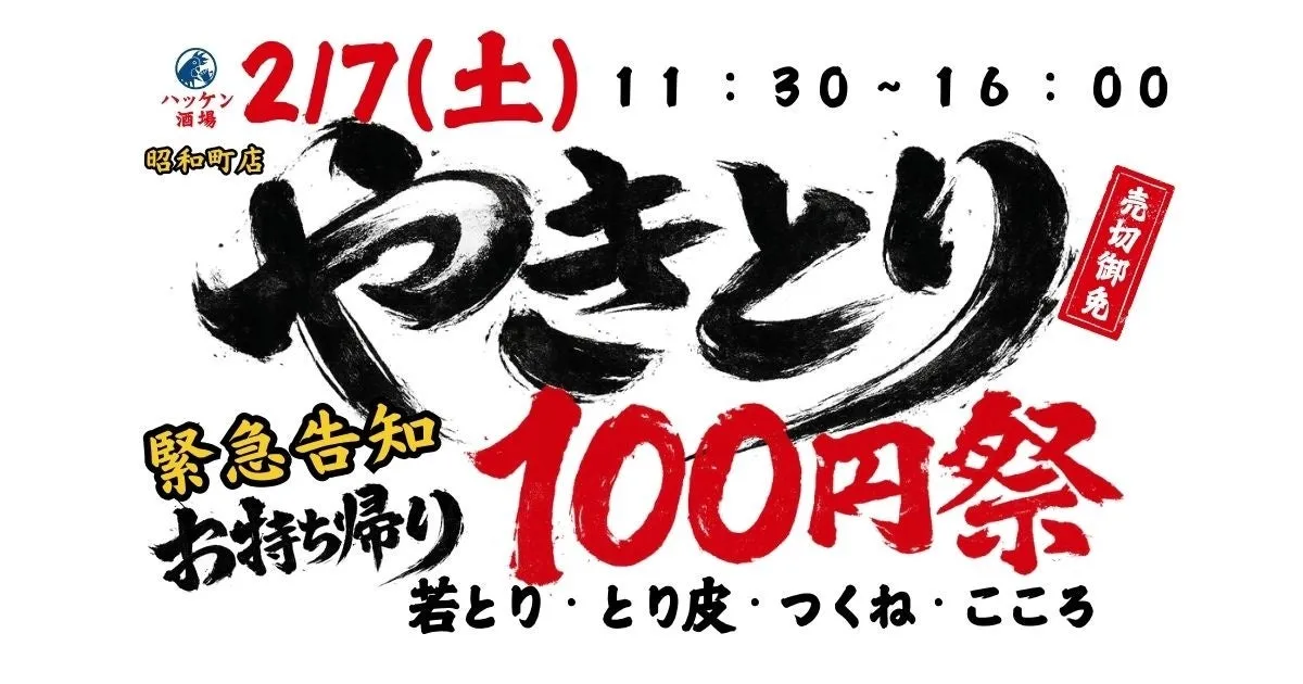 大阪市阿倍野区の人気居酒屋チェーン、ハッケン酒場が開催する一日限りの特別イベント『やきとり100円祭』が、2026年2月7日(土)に実施されます。このイベントでは、ハッケン酒場自慢のやきとりを特別価格の1本100円(税抜)で提供し、地域の皆様への感謝の気持ちを込めて1,500本のやきとりを準備します。