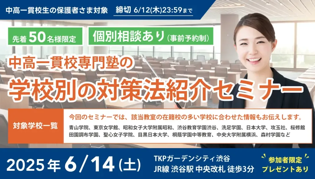 2025年6月14日(土)、東京・渋谷で、中高一貫校に通う生徒とその保護者を対象とした「学校別の対策法紹介セミナー」が開催されます。このセミナーは、中高一貫校専門の個別指導塾『WAYS』が主催します。
