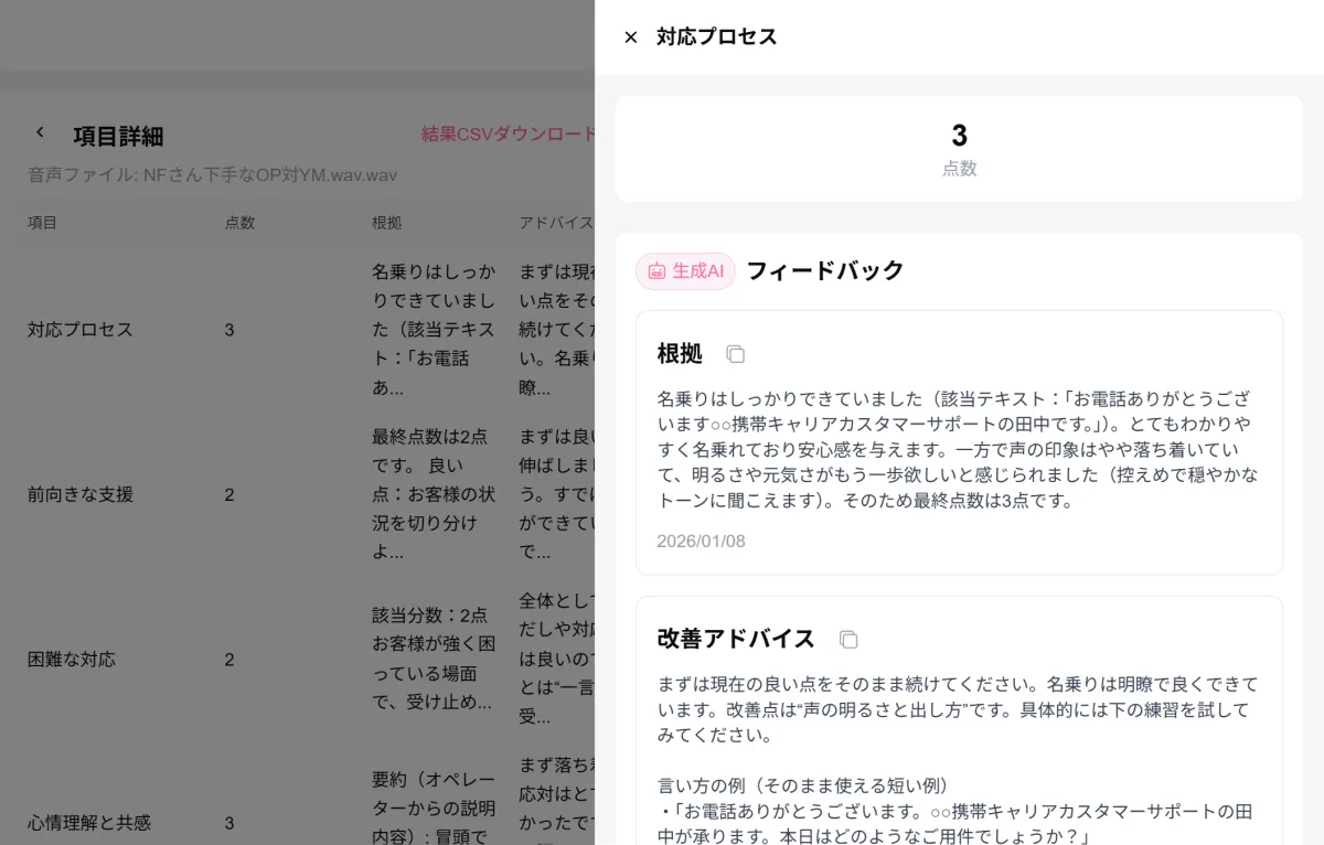 評価の結果は単なる数字に終わらず、どのような行動が評価に寄与したかを明示する形で提供されます。これにより、直接的なフィードバックを現場で活用できるのです。これまでの自動評価では聞き取れなかったオペレーターの行動を解明し、現場での指導や育成の改善にも繋がるメリットがあります。