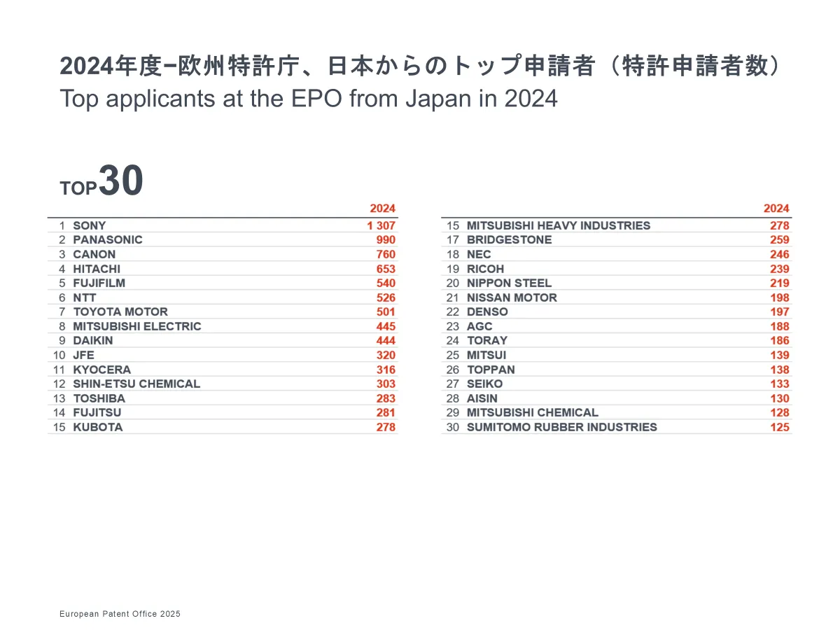 特許出願件数に基づく企業ランキングでは、ソニーグループが1,307件の出願によりトップ10に入依しています。ソニーは2023年に続いて9位に位置し、特にコンピュータ技術、防衛技術、デジタル通信の分野で高い評価を受けています。そのほか、パナソニック(990件)、キヤノン(760件)、日立(653件)と続きます。トヨタ自動車も輸送分野で大きな伸びを見せ、特許出願数を前年比12.7%増加させ、注目を集めています。