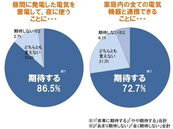 2012年3月に行われた消費者調査(パナソニック株式会社)によると、太陽光発電システム導入への期待として「昼間に発電した電気を蓄電して夜に使う」と回答した人は86.5%にものぼりました。また「家庭内の全ての電気機器との連携」を期待する声も72.7%と高い数値を示しています。東日本大震災以降、節電意識の高まりとともに、家庭での発電・蓄電への期待が大きく膨らんでいることがわかります。