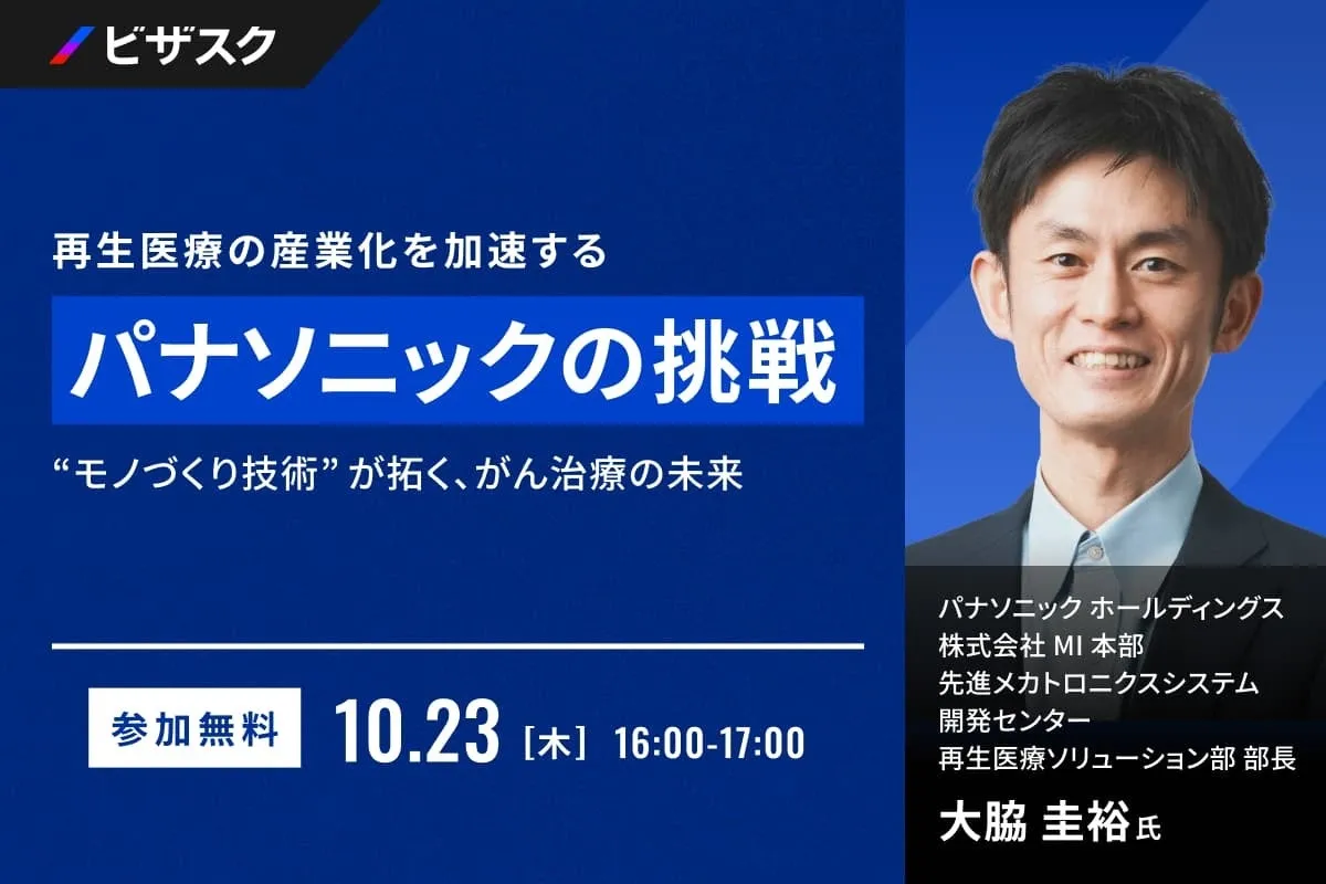 2023年10月23日、株式会社ビザスクが開催する無料オンラインセミナー『再生医療の産業化を加速する、パナソニックの挑戦〜“モノづくり技術”が拓く、がん治療の未来〜』にて、パナソニックホールディングス株式会社の大脇圭裕部長が登壇します。このセミナーは、パナソニックが持つ豊富なモノづくり技術を再生医療分野に応用する取り組みと、それによってがん治療の未来にどのように寄与できるかを探る貴重な機会です。
