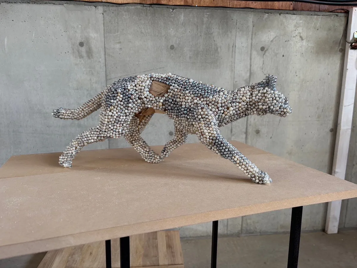 加治氏は、新潟県村上市出身のアーティストで、動物をテーマにした作品を数多く手がけています。彼の作品の特徴は、動物のしなやかな筋肉や躍動感が表現されており、廃材を用いた場合でもその美しさを損なうことはありません。木材が持つ温かみとネイチャーパールの光が融合し、まさに希少なアート作品が誕生しました。