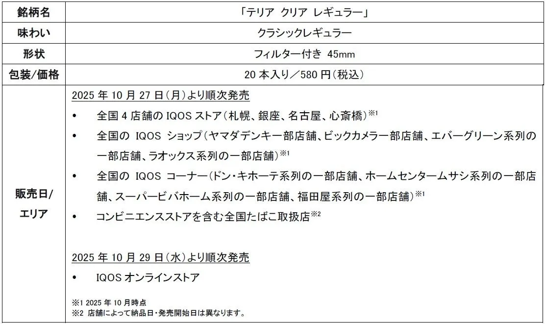フィリップ モリス ジャパン合同会社(PMJ)が、加熱式たばこであるIQOS ILUMA i(イルマ アイ)およびIQOS ILUMA(イルマ)専用のたばこスティック「TEREA(テリア)」から、新たに「テリア クリア レギュラー」を2025年10月27日にリリースします。この新商品は、全国のIQOSストアや各種たばこ取扱店、さらにIQOSオンラインストアでも購入可能となる特製商品です。