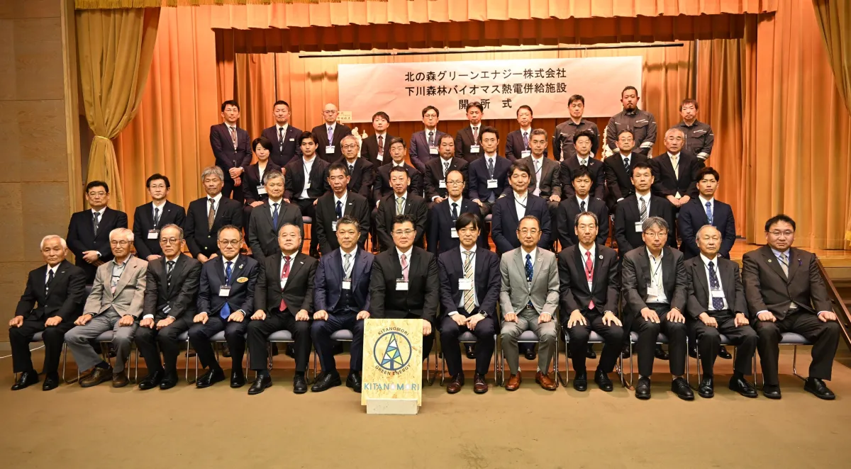 開所式には、下川町の町長をはじめとする地元自治体、原木供給者、電力供給業者など、約50名が参加しました。挨拶や事業概要のプレゼンテーション、動画配信、さらに工場見学が行われ、関係者間の交流が図られました。