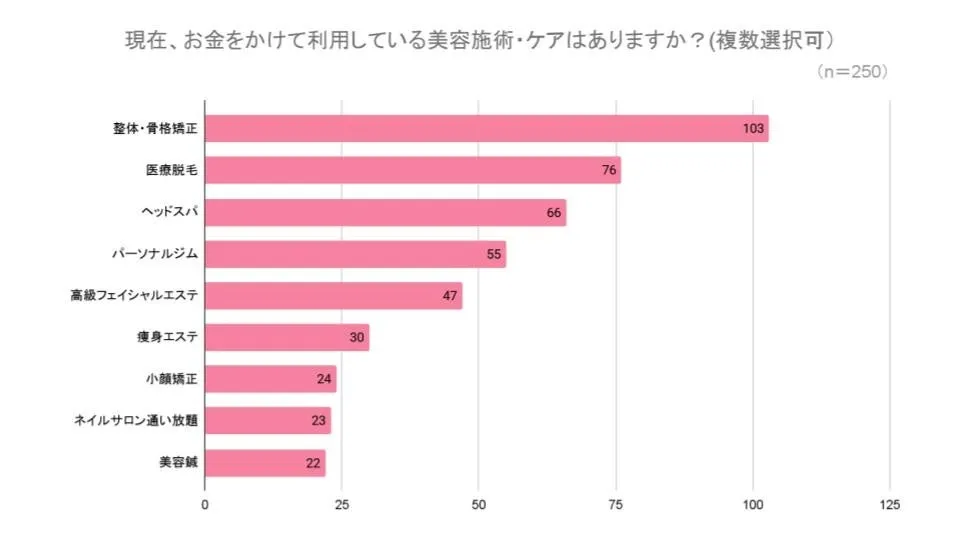 美容施術の中で最も多く利用されているのは「整体・骨格矯正」で、次いで「医療脱毛」、「ヘッドスパ」と続きます。これらは身体のメンテナンスやリラクゼーションを目的としたサービスです。また、「パーソナルジム」や「高級フェイシャルエステ」など、外見や体型の改善に関する施術にも高い関心が寄せられています。性別や年齢を問わず、健康と美容に対して具体的な_action_が習慣となっている様子が窺えます。
