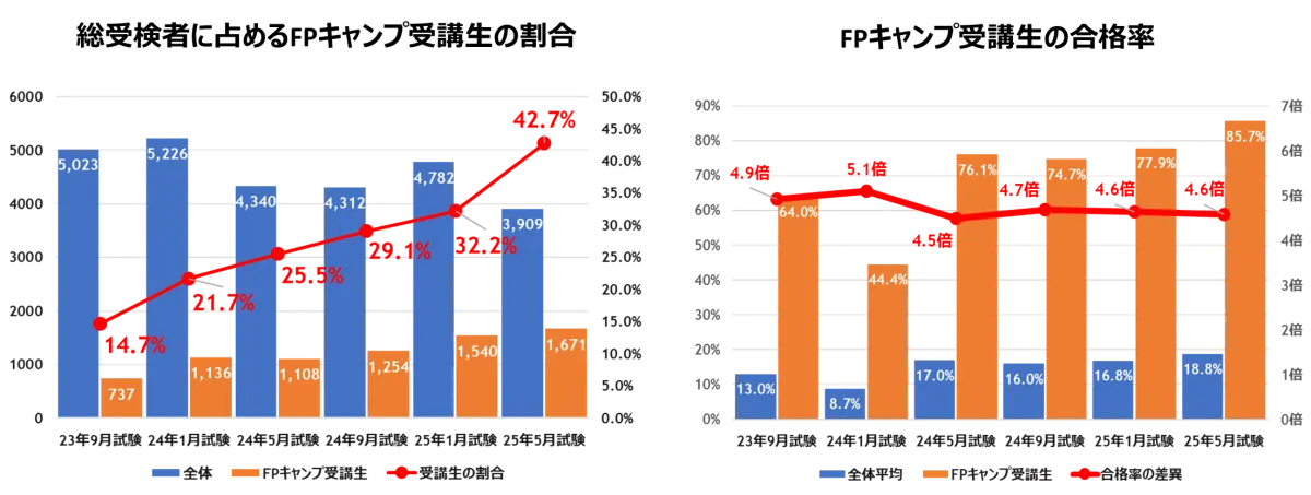 株式会社スクエアワークスが運営するオンライン資格スクール「FPキャンプ」は、2025年5月のFP1級学科試験において、受講生が全体の42.7%を占め、合格率はなんと85.71%という圧倒的な結果を記録しました。これは、全体合格率18.75%の約4.6倍にあたります。この成功は、FPキャンプのユニークな学習メソッドに支えられています。