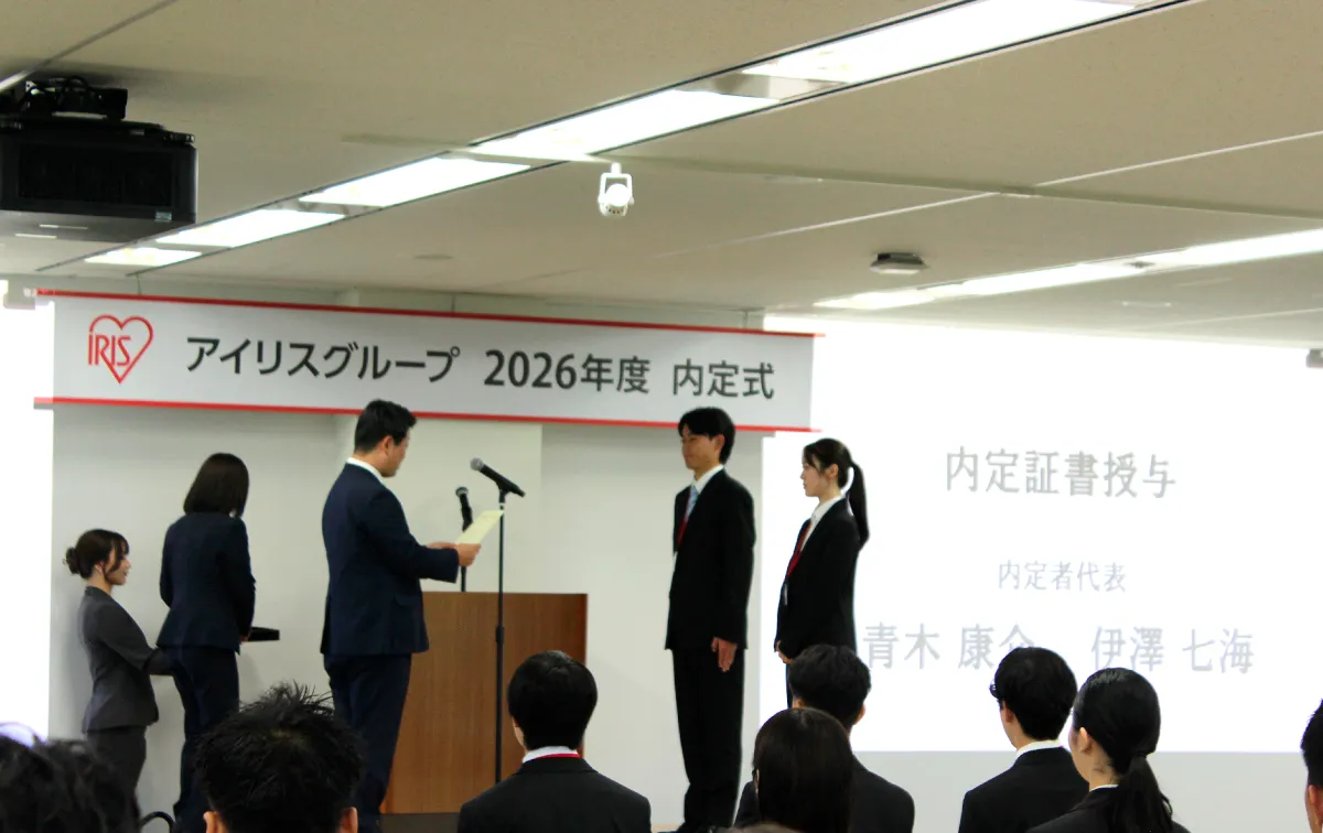内定式では、アイリスオーヤマ株式会社の代表取締役社長である大山晃弘氏が祝辞を述べ、社会の変化に柔軟に対応し続ける企業姿勢を強調しました。ブランドのグローバル展開や新規事業開発の重要性を訴え、内定者たちに熱意をもって一緒に未来を築いていくことを呼び掛けました。内定者代表の藤本飛龍さんは、アイリスグループの挑戦的な姿勢に惹かれ、自身の経験を活かし、将来的にはジャパン・ソリューションだけでなく、グローバルな分野でも貢献する意向を表明しました。