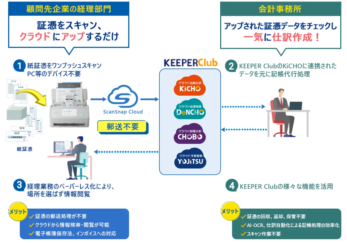 株式会社PFUが提供するイメージスキャナー「ScanSnap」シリーズが、法人向けに開発されたクラウド財務管理システム「KEEPER Club」との連携機能を新たに追加しました。2023年10月2日より利用開始となり、これにより業務の効率化が図られます。この連携により、ScanSnapでスキャンした書類は、スムーズにKEEPER Clubに保存されるようになります。