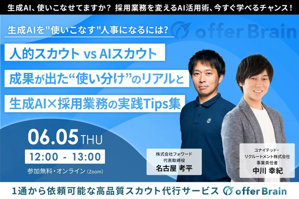 - - タイトル: 生成AIを“使いこなす”人事になるには? 人的スカウト vs AIスカウト 成果が出た“使い分け”のリアルと生成AI×採用業務の実践Tips集