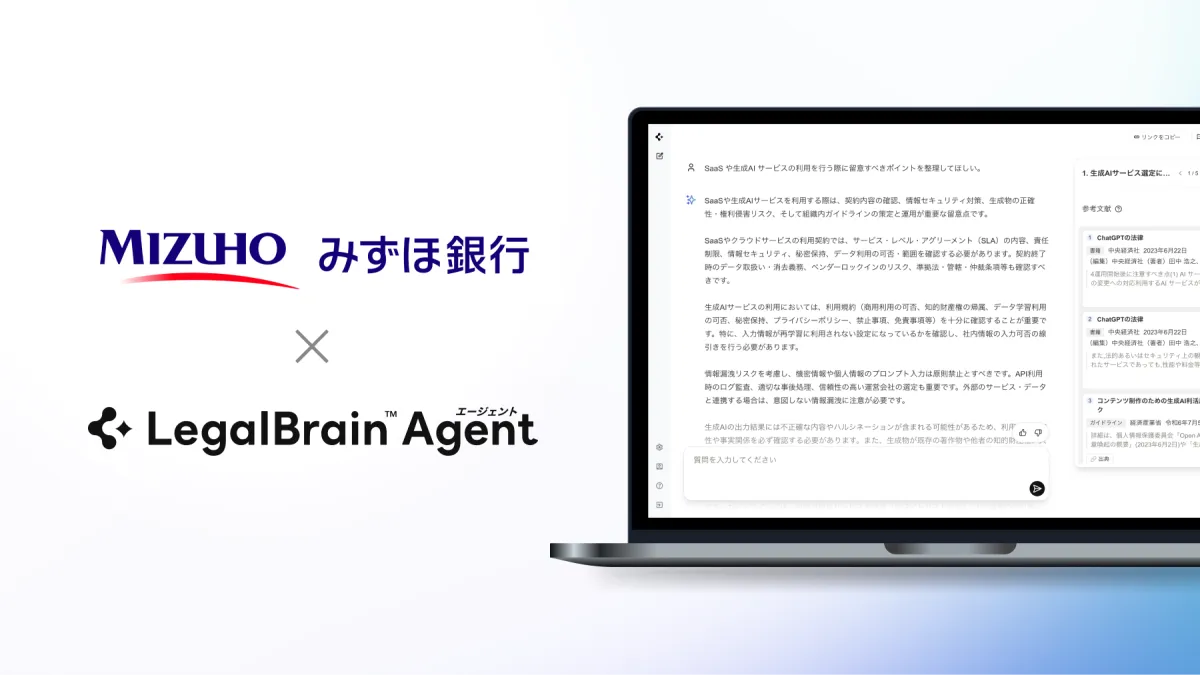 みずほ銀行による導入の決め手は、回答の明確さと継続的なサービスの進化です。利用中における応答速度の向上や、トライアル期間中の改善が高く評価されています。「Legal Brainエージェント」は、法律の専門家を支えるために開発されているため、ユーザーの声を反映した改良にも力を入れています。