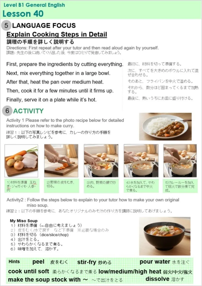 改訂後の「日常英会話」コースでは、各レベル(A1〜B1)のレッスンが4つのカテゴリに分かれており、受講者は自己のニーズに合わせてレッスンを選択できるようになっています。特に注目すべきは、「Narrative(説明する力)」パートです。ここでは、実用的なシーンを通して、まとまった英語を使って説明するスキルを養うための内容が強化されており、多彩な写真や図版を使用したアクティビティが豊富に用意されています。