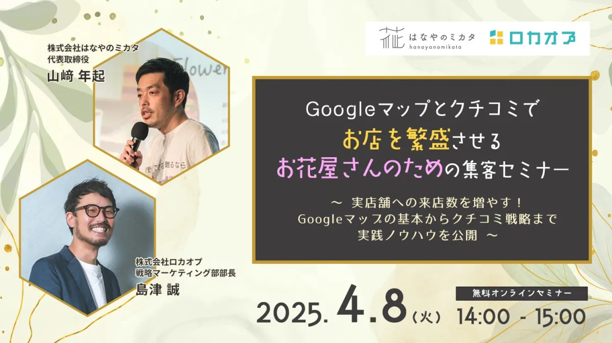 株式会社ロカオプと株式会社はなやのミカタが共催する無料オンラインセミナー「Googleマップとクチコミでお店を繁盛させるお花屋さんのための集客セミナー」が、2025年4月8日(火)14:00から開催されます。