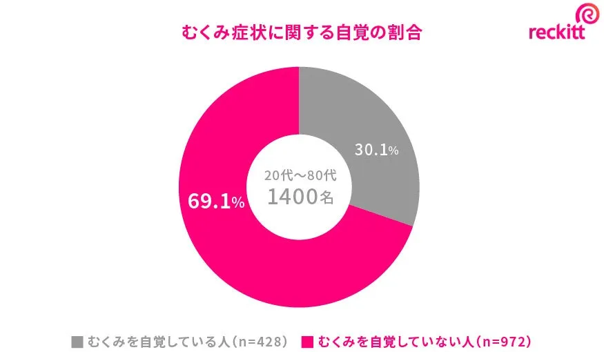 レキットベンキーザー・ジャパンが実施した調査によると、全国の男女1,400人を対象にした結果、全世代で63.7%が無自覚にむくみのリスクを抱えていることがわかりました。特にシニア世代では65.8%に達しており、特に男性に多い傾向が見られています。