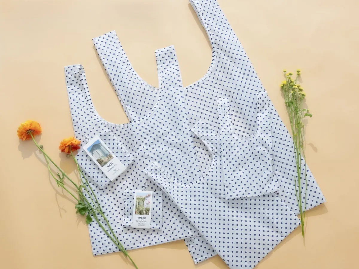 ロンハーマンとのコラボによる特別なBAGGUバッグは、白地にネイビーのドット柄が施されています。このデザインは、ロンハーマンのコーポレートカラーを反映したもので、ドットの間隔が調整され、オリジナル性の高いパターンを採用しています。また、パッケージにはカリフォルニアの穏やかな光景がデザインされており、バッグ自体のみならず、その全体の雰囲気も楽しむことができます。