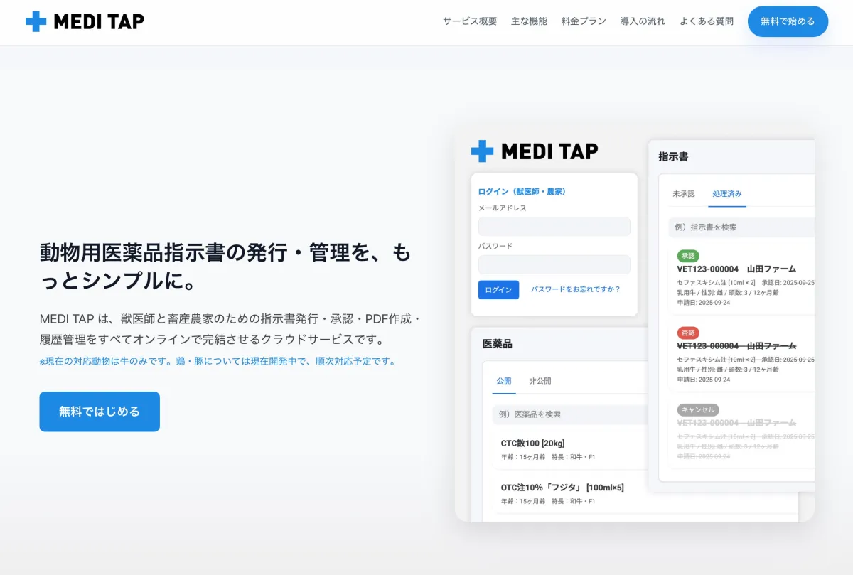 株式会社ERanchersが新たに提供を開始した医薬品指示書DXプラットフォーム『メディタップ(MediTap)』は、産業動物獣医師に特化した革新的なサービスです。現場の実務に即した設計により、獣医療における医薬品指示書作業の標準化を推進します。本プラットフォームは、ポジティブリスト制度に対応した形で開発され、従来の手書きや分散管理に依存する業務からの脱却を図ります。