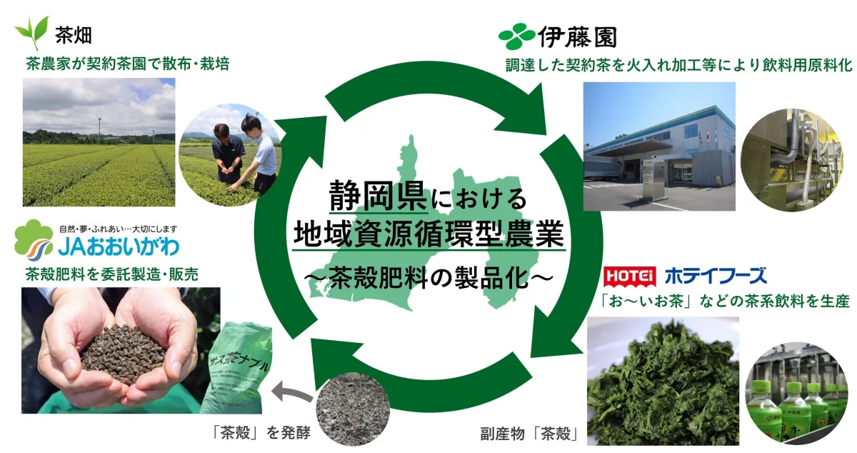 2025年8月に、静岡県内において新たな取り組みが開始される。株式会社伊藤園、大井川農業協同組合(JAおおいがわ)、株式会社ホテイフーズコーポレーションの3者が共同で、茶殻を肥料化し、地域資源循環型農業を推進するという。具体的には、茶系飲料「お~いお茶」の生産時に出る茶殻を利用した肥料を、契約茶園で散布し、持続可能な農業を実現しようとしている。